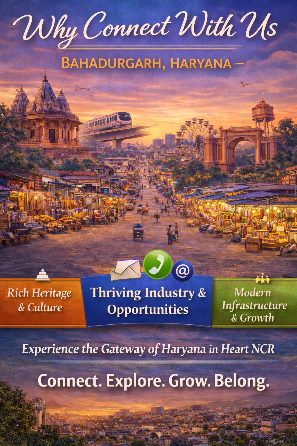 Life here is enriched by local traditions, colorful festivals, and the warmth of its people. Bustling bazaars, street food, and community gatherings showcase the true spirit of Haryana, where simplicity and hospitality are part of everyday life. With excellent road networks, rail connectivity, and metro access to Delhi, Bahadurgarh offers the convenience of urban growth while maintaining a calm and friendly atmosphere.